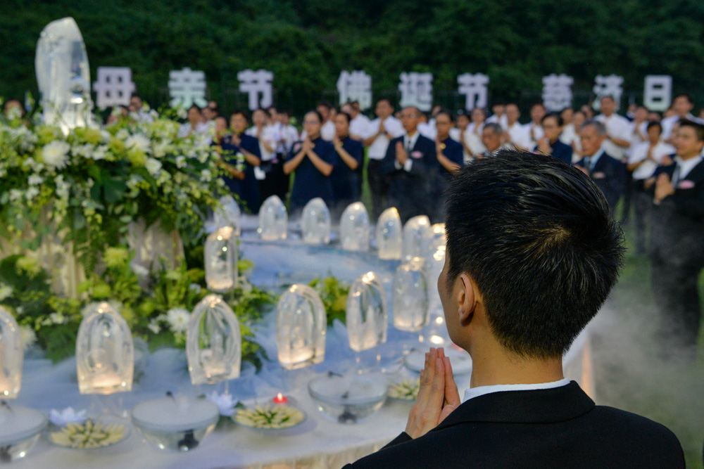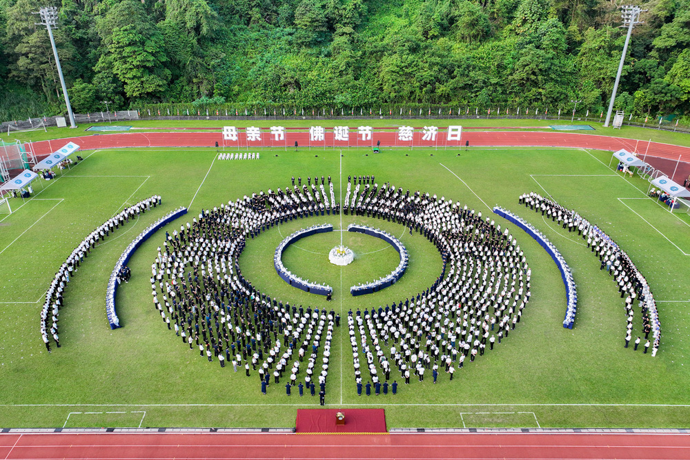 户外体育馆正中央,是庄严纯净的琉璃佛像,上千名志工和会众环绕,组成图腾队形,虔诚一念,绕佛绕法,礼佛浴佛。